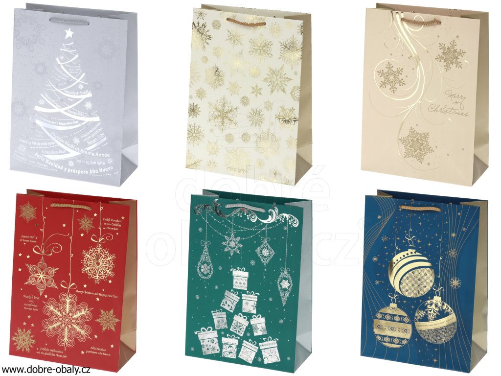 Luxusní papírové tašky s vánočním motivem. Tašky jsou v matném provedení, na přední straně je metalicky lesklý motiv, široké boční záložky s matným potiskem, zadní strana matný tisk. Balení obsahuje mix motivů, nelze jednotlivě selektovat. Tašky jsou vyrobeny z velmi kvalitního pevného papíru (gramáž 180g/m²), mají elegantní pletená textilní ouška. Rozměry: šířka 23 cm, výška 32 cm, šířka dna a bočních záložek 11 cm.