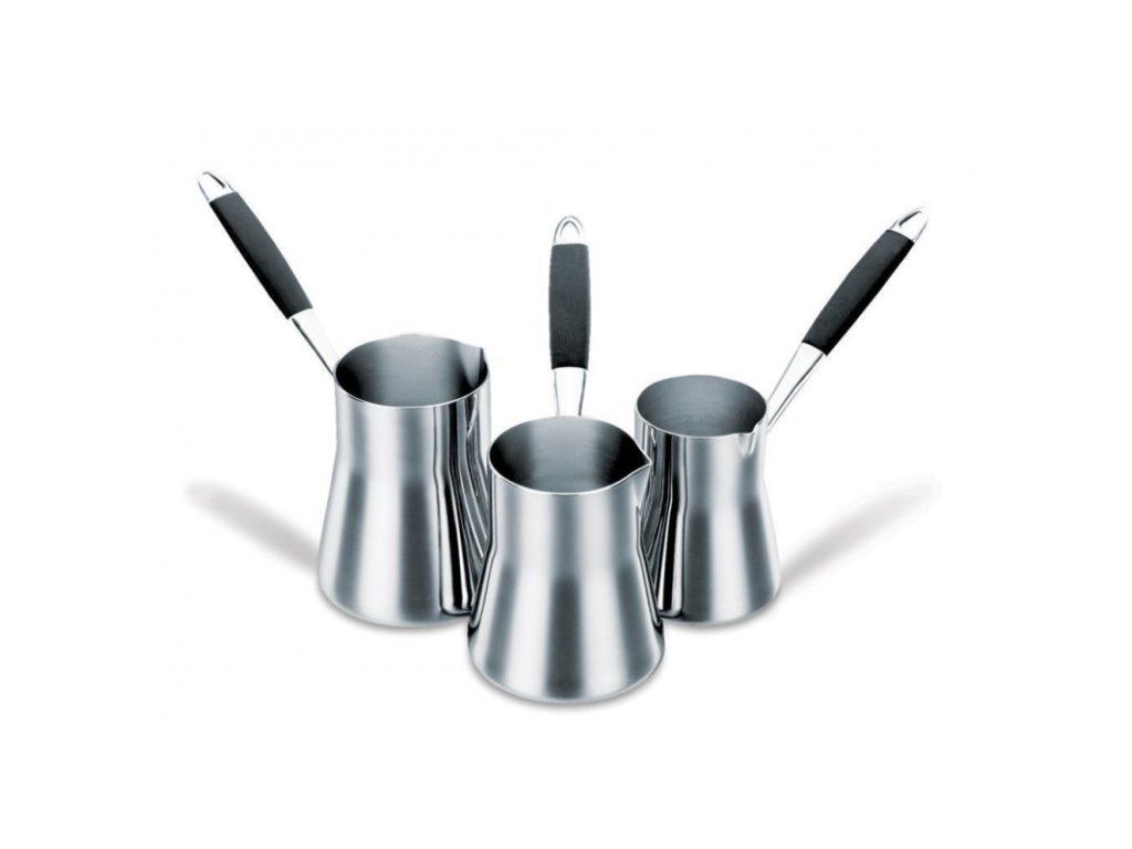 Kvalitní nerezová ocel, rovné, zabroušené dno, leštěný povrch, rukojeti z nerezové oceli potažené černým silikonem, vhodné pro všechny typy plotýnek kromě indukce. Tyto džezvy můžete mýt v myčce.